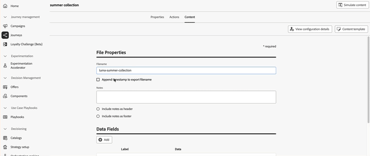 Supporto per metadati generati dall’utente: la funzione helper executionMetadata, ora disponibile nell’editor di personalizzazione per le campagne orchestrate, consente di allegare informazioni contestuali a qualsiasi azione nativa e di memorizzarle in un set di dati per l’esportazione in sistemi esterni. Ulteriori informazioni