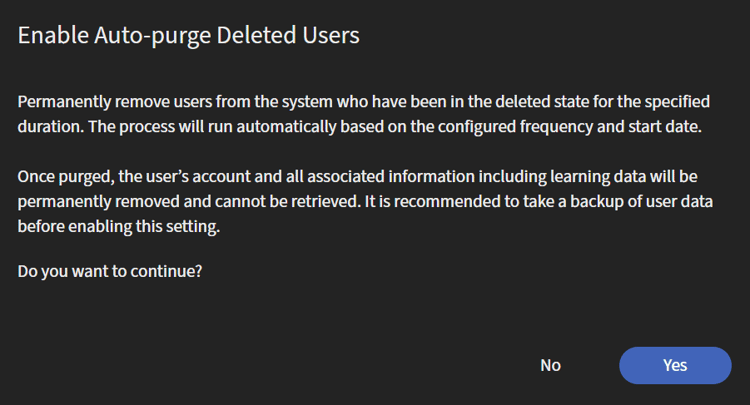 Viene visualizzata una finestra di dialogo che richiede una conferma. Una volta rimossi, tutti i dati utente e i record di apprendimento associati all’utente selezionato vengono cancellati in modo permanente. Una volta effettuata la rimozione, l’azione non può essere annullata. Per confermare, fai clic su Rimuovi.