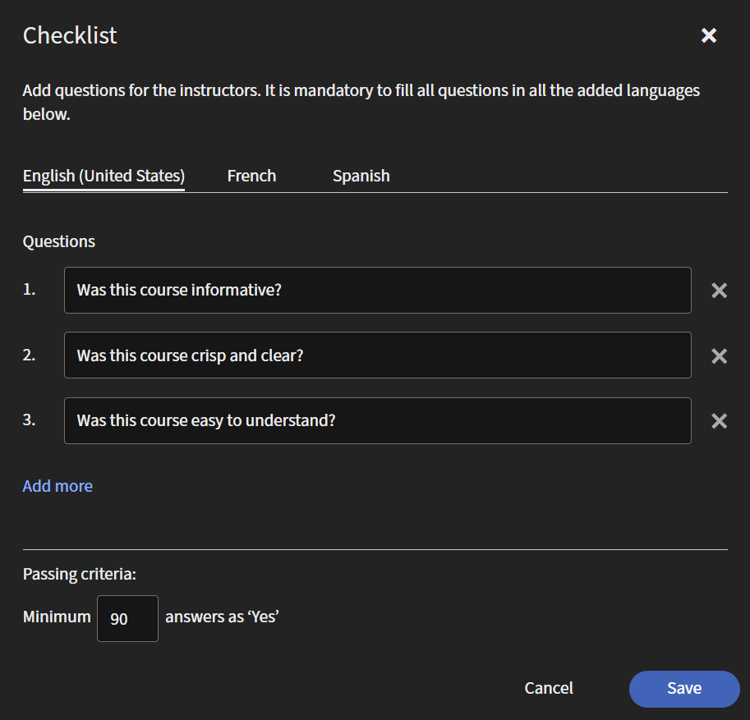 - Se necessario, aggiungi le etichette di conformità personalizzate al corso. Consulta Aggiungere etichette di conformità a corso/percorso di apprendimento/certificazione.