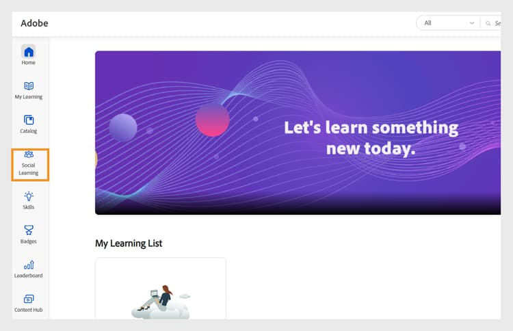 In tutte le pagine di Apprendimento sociale è presente il campo di ricerca, che consente agli utenti di cercare una bacheca, un’abilità o un contenuto particolari. Per effettuare una ricerca, digita nel campo di ricerca e fai clic sull’icona di ricerca o premi il tasto Invio sulla tastiera.