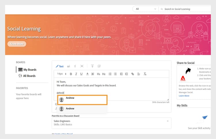 Abilita l’apprendimento collaborativo selezionando Apprendimento sociale per accedere alle aree discussioni, condividere approfondimenti e assegnare tag agli utenti per il coinvolgimento interattivo -