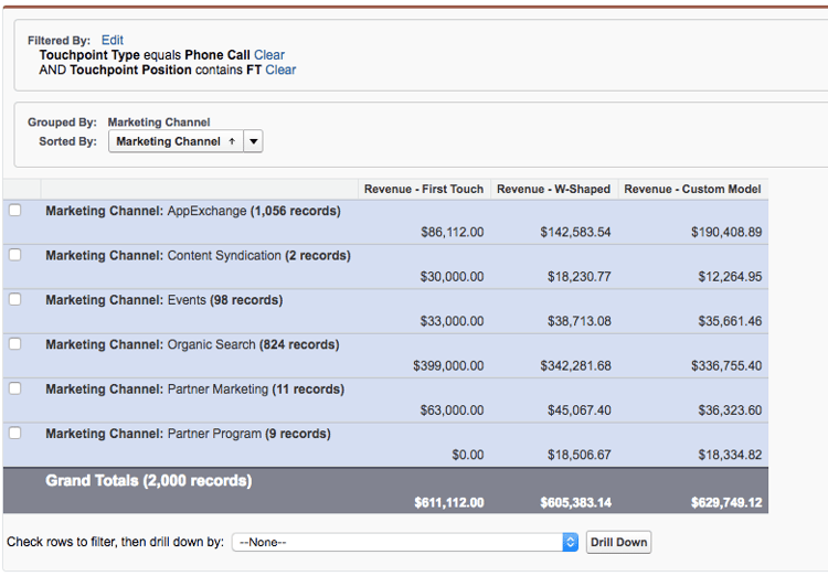 I valori del tipo di punto di contatto che Marketo Measure invia in genere sono Visita Web, Modulo Web o Chat Web, ma nel caso dei punti di contatto di CallTrackingMetrics il tipo di punto di contatto è Chiamata telefonica. In questo modo gli addetti al marketing possono vedere quali canali assorbono il maggior numero di telefonate e generare ricavi per la loro organizzazione.