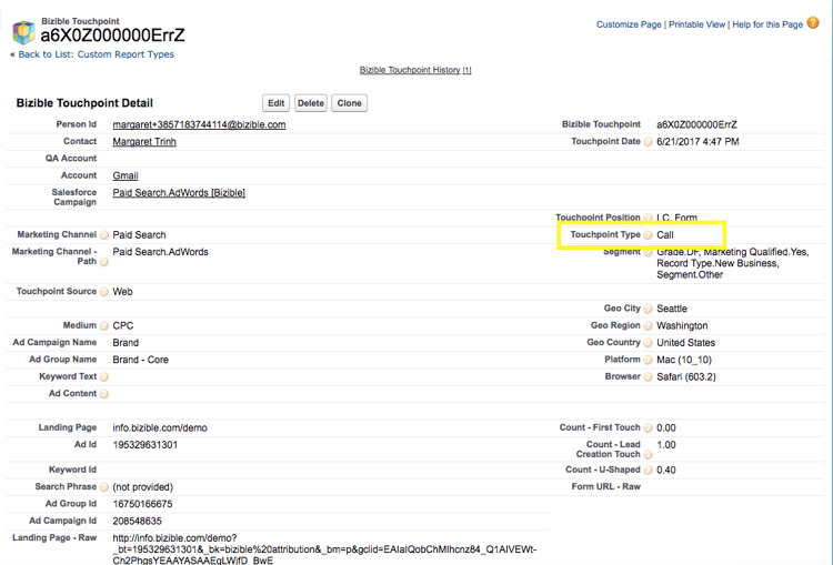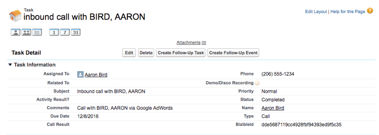 Quando un visitatore accede al tuo sito e effettua una telefonata, è compito di CallTrackingMetrics inviare tali dati a Salesforce. In genere, viene creato un Salesforce Task che popola dati quali numero di telefono, oggetto, tipo e ora, il BizibleId