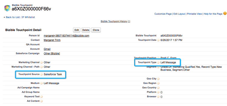 Innanzitutto, controlla l'Attività per assicurarti che sia popolato BizibleId. Se non è presente alcun valore, non è possibile creare un punto di contatto. Questa situazione deve essere aggravata con CallTrackingMetrics.