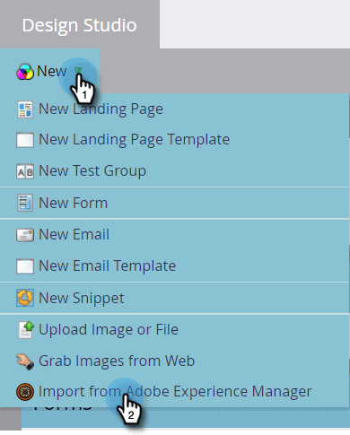 Fare clic sul menu a discesa Nuovo e selezionare Import from Adobe Experience Manager.