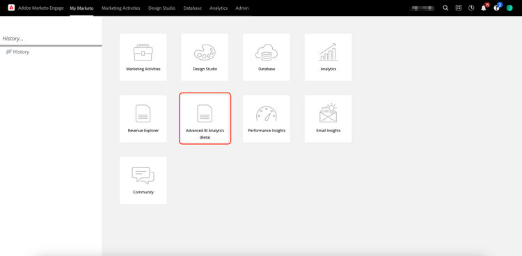 Nel Marketo personale, fare clic sul riquadro Advanced BI Analytics.