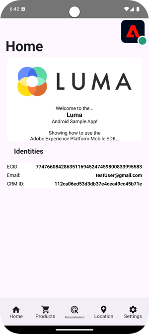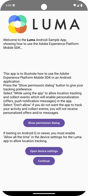 Luma Mobile App Sessione l'URL di base, ovveroandroid:schemeeandroid:hostdefiniti in AndroidManifest.xml in Android Studio, separati da://. Esempio:lumatutorialandroid://default -