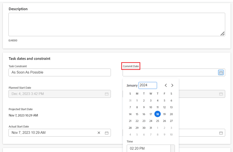 (Condizionale e facoltativo) Se l'amministratore del Workfront o del gruppo ha aggiunto la Data conferma all'intestazione dell'attività o del problema, fare clic sul campo Data conferma nell'intestazione, quindi selezionare una data dal calendario. Se la Data del commit non è nell'intestazione, procedere come segue.