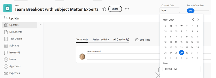 Puoi aggiornare manualmente la data di conferma di un’attività o di un problema che ti è stato assegnato. Per ulteriori informazioni su Conferma date in Adobe Workfront, consulta Panoramica sulla conferma data.