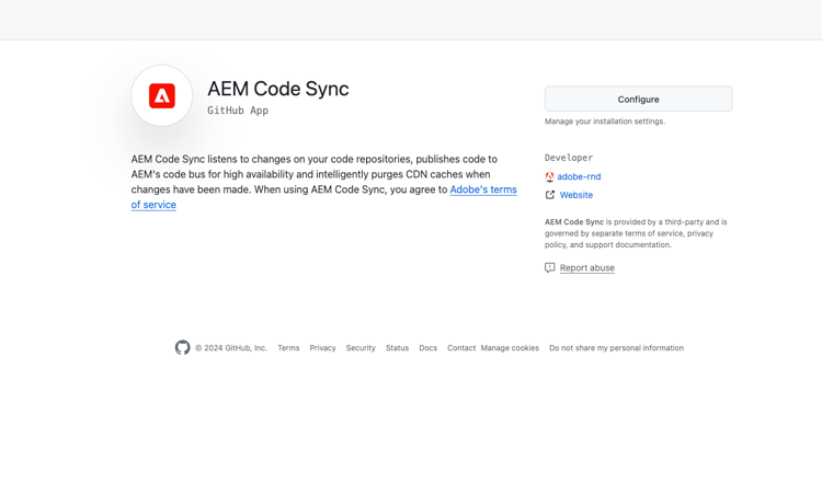 - Nello stesso browser, passa all’app AEM Code Sync e configurala.