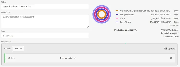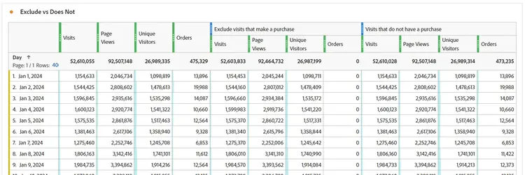 - Se tutti gli hit nella visita restituiscono falso, allora quel visitatore verrà restituito nel set di dati, e saranno quindi restituiti i visitatori che non hanno fatto “X”.