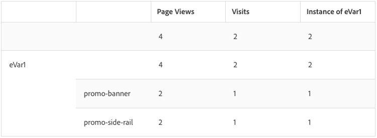 - L’istanza non ripetuta restituirà solo la prima volta che viene impostato il valore della dimensione. Ad esempio, anche se non trattato nell’esempio precedente, se l’utente ha fatto clic più volte sul banner promozionale e quindi l’istanza dell’eVar viene incrementata per ogni clic sul banner, con questa impostazione verrà considerata solo la prima istanza univoca di “promo-banner” ignorando eventuali conteggi successivi per questo banner.