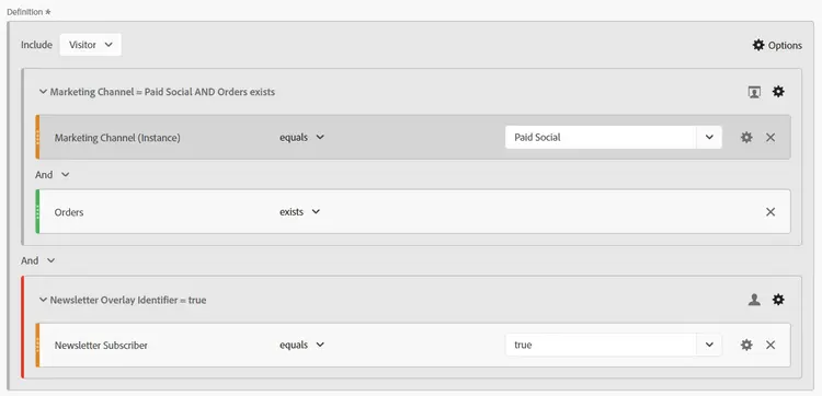 Esempio di segmento 6: visitatori che hanno effettuato un ordine durante una visita con un’istanza social a pagamento, escludendo i visitatori iscritti a una newsletter