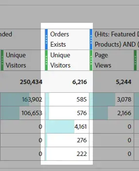 Qui sto confrontando gli hit per offerte in primo piano/contenuti consigliati, agli ordini esistenti, al segmento complesso in cui una stessa visita comprende sia l’ordine sia una delle pagine specificate. Il segmento complesso è dato dall’intersezione dei primi due segmenti; ma poiché il suo ambito è Visitatore, verranno restituite anche tutte le altre visite per tali visitatori.