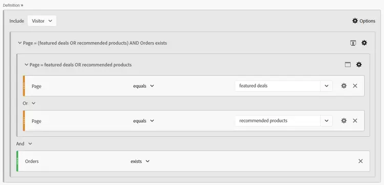In questo segmento vengono combinati tutti e tre gli ambiti. Il livello superiore del segmento è Visitatore, affinché per il visitatore corrispondente vengano restituiti tutti gli hit da tutte le visite. Al suo interno abbiamo aggiunto un contenitore con ambito Visita, per assicurarci che per il visitatore sia stata registrata almeno una visita corrispondente ai criteri specifici di effettuare un ordine E aver visitato pagine specifiche. Abbiamo aggiunto un contenitore con ambito Hit per le pagine stesse, così possiamo utilizzare la logica OPPURE per cercare la pagina delle offerte in primo piano O quella dei prodotti consigliati.