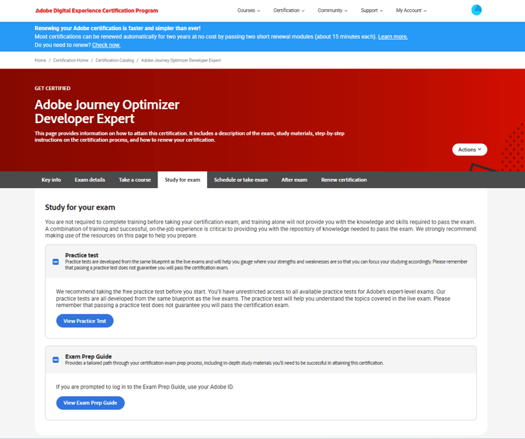 Oltre ai collegamenti per Adobe Analytics e Adobe Customer Journey Analytics condivisi in precedenza, tutti gli esami correnti e i relativi dettagli sono sempre consultabili nel catalogo delle certificazioni disponibileportale delle certificazioni Adobe.