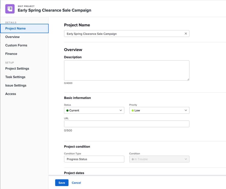 注: 編集オプションで開くプロジェクト詳細ウィンドウでは、左メニューのプロジェクト詳細を使用しているときには表示されないフィールドにアクセスできます。