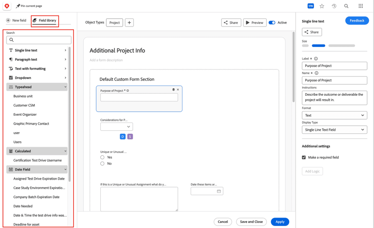 Workfront では、2 つのフィールドに同じ名前を付けることはできません。フィールドに一般的な名前が付いている場合、そのフィールドは既に存在する可能性があります。新しいフィールドを作成する前に、フィールドライブラリを確認して、既に存在するかどうかを確認してください。