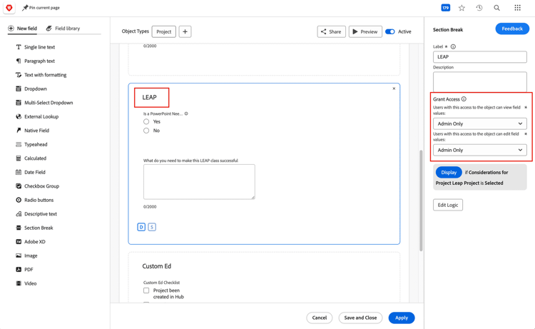 データの損失を防ぐために、不要なフィールドをカスタムフォーム自体に隠します。カスタムフォームのセクションブレイクを使用すると、ユーザーがアクセスして表示、貢献、または管理する権限を持っているWorkfrontオブジェクトに基づいて、そのセクションのフィールドを隠すか表示するかを選択できます。また、セクションを管理者専用に設定することもでき、システム管理者のアクセスレベルを持つユーザーのみがフォームのそのセクション全体を表示できます。
