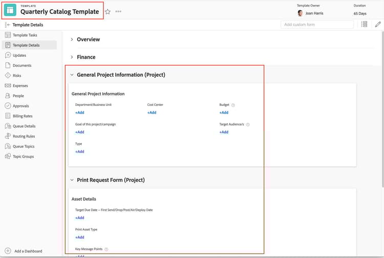 また、あまり変更されないフィールドや特定の情報が必要なフィールドをテンプレートに入力することもできます。いくつかの情報が既に入力されていると、プロジェクトの作成が速くなり、カスタムフィールドがすべての適用プロジェクトに正確かつ完全に入力されることが保証されます。