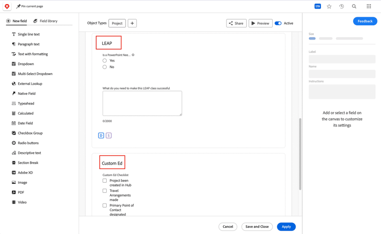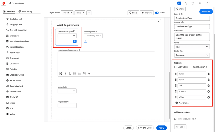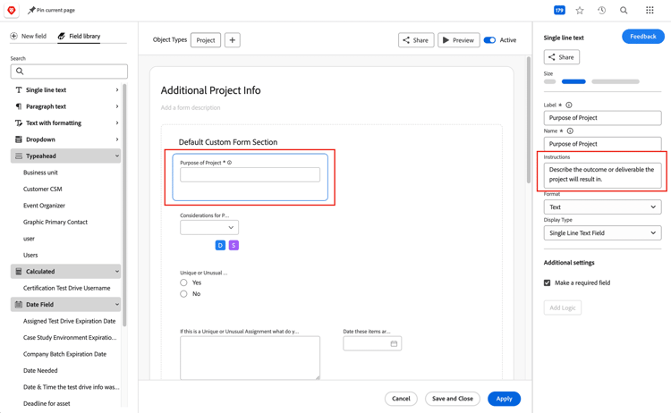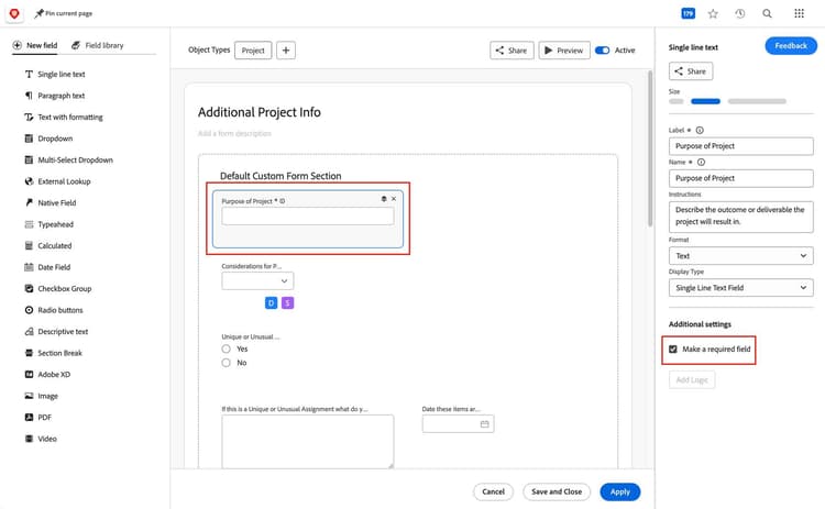 更新を行う際は、これらの変更がAdobe Workfrontの他の側面にどのように影響するかに注意してください。例えば、フィールド名を変更すると、そのフィールドを使用する計算が壊れる可能性があります。また、フォームのラベルや名前を変更すると、レポートが必要な情報を表示しなくなったり、他のシステムとの統合が実行されなくなったりすることがあります。
