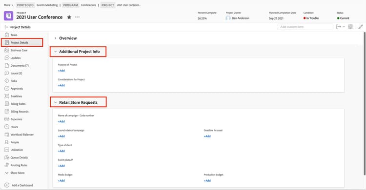 Workfrontのカスタムフォームはオブジェクトに添付され、ユーザーがその作業項目に特有の情報を提供および表示できるようにします。カスタムフォームは、プロジェクト、タスク、およびリクエストで一般的に使用されます。