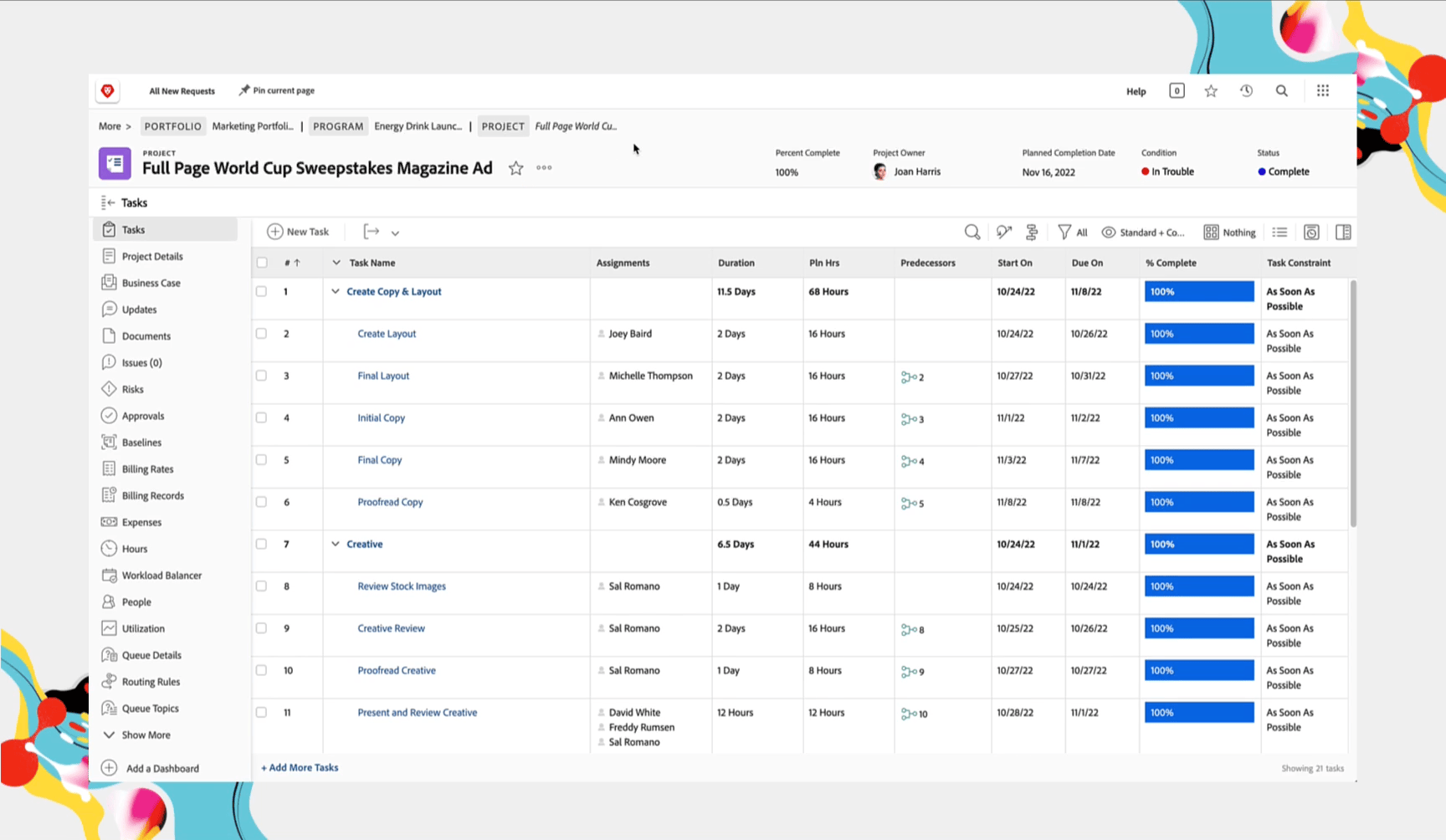 プロジェクトマネージャーやプロジェクトを作成する人々の時間を節約するために、KarenはWorkfrontの推奨に従って、カスタムフォームをプロジェクトテンプレートに添付します。彼女はテンプレート内のプロジェクトとタスクの両方にカスタムフォームを添付します。