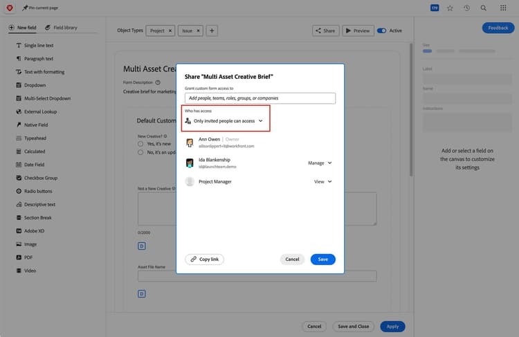 カスタムフォームへのアクセスを制限したい場合は、招待された人のみがアクセスできるを アクセス権を持つ人 フィールドから選択してください。すると、カスタムフォームは共有ウィンドウにリストされている人、チーム、役割、グループ、または会社のみが利用可能になります。