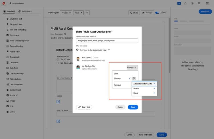 「 カスタムフォームアクセスを付与 」フィールドに、このカスタムフォームをWorkfrontのアイテムに添付できるユーザー、チーム、職務、グループ、または会社の名前を入力します。
