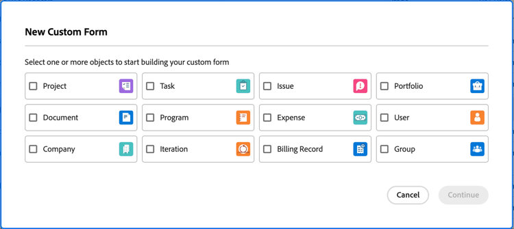 カスタムフォームは、Adobe Workfront の複数のオブジェクトタイプに対して作成できます。