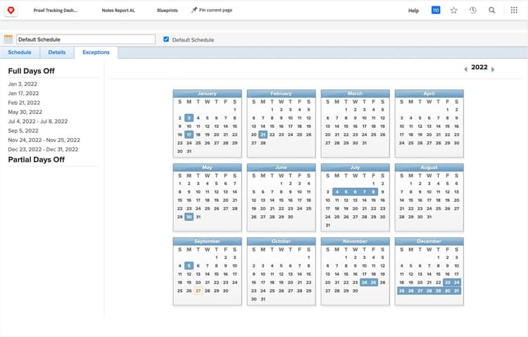 「例外」タブで、休日やその他の会社の休暇、つまりユーザーが働かない日をマークします。