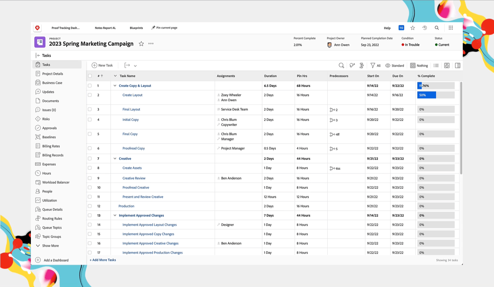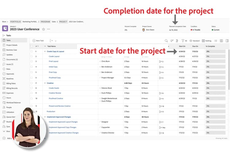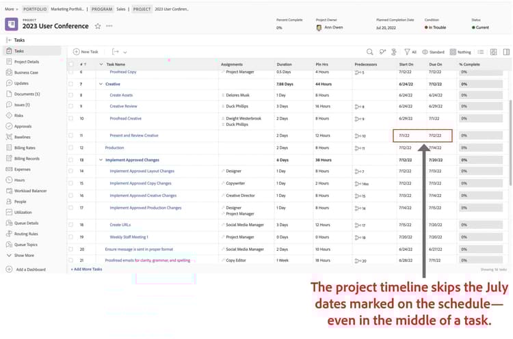 スケジュールを割り当て、Workfrontがプロジェクトのタイムラインを計算する際にどのようにスケジュールを優先するかを理解することで、全員がプロジェクトの締め切りを守るのに役立ちます。さらに、カレンは、これらの設定がシステムおよびグループ管理者がプロジェクトのタイムラインが期待通りに機能しない場合に、ユーザーとともにトラブルシューティングを行うのに役立つことを知っています。