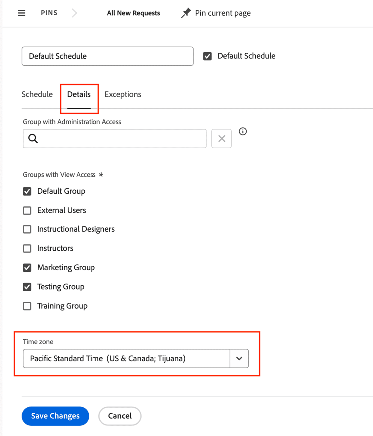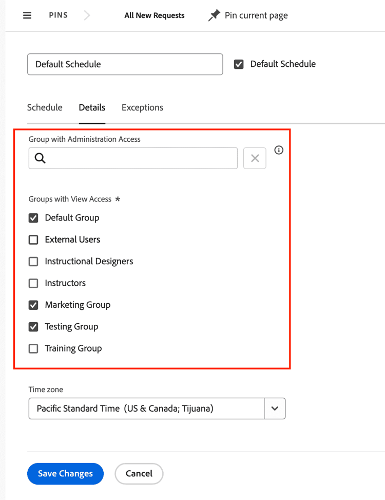 管理アクセス権を持つグループフィールドは、選択したグループのグループ管理者にこのデフォルトスケジュールを編集する権限を付与します。注:これはシステム全体のデフォルトスケジュールであるため、システム管理者以外の誰にも編集アクセス権を与えないことをお勧めします。