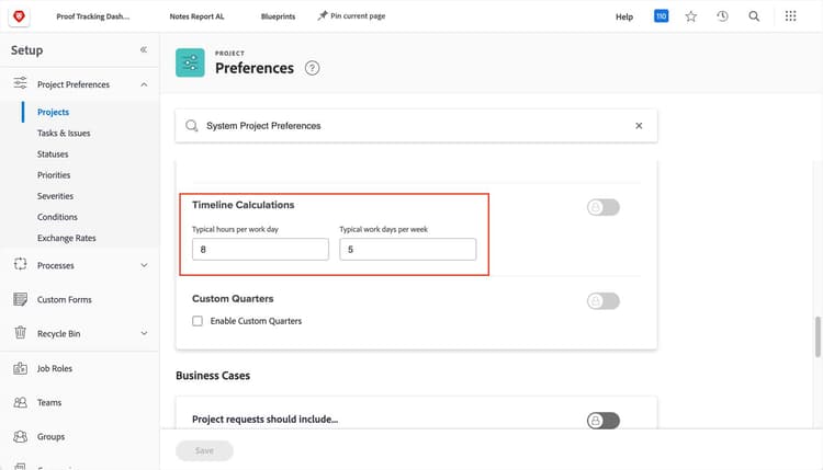 注: システムのグローバルプロジェクト設定は、 セットアップ > プロジェクト設定 > プロジェクト > タイムライン計算 > 1日の標準勤務時間 で行います。