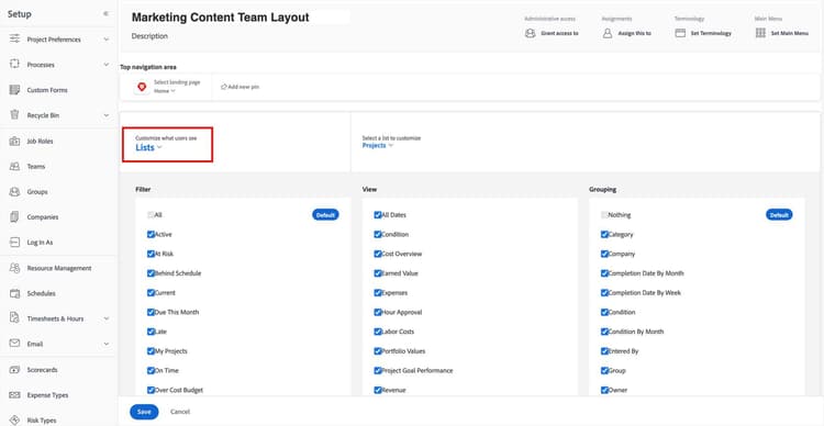 レイアウトテンプレートに関しては、少ないほど多いです。レイアウトテンプレートに必要なメインメニューオプション、左パネルメニューセクション、オブジェクト詳細フィールド、リストオプションなどのみを含めることで、不要なノイズを排除し、ユーザーのナビゲーションを簡素化します。クリックする項目が多すぎると、Workfrontがすぐに混乱します。よく設計されたレイアウトテンプレートは、ユーザーの効率とWorkfrontでの作業のしやすさを向上させます。これにより、ユーザーの採用が促進されます。
