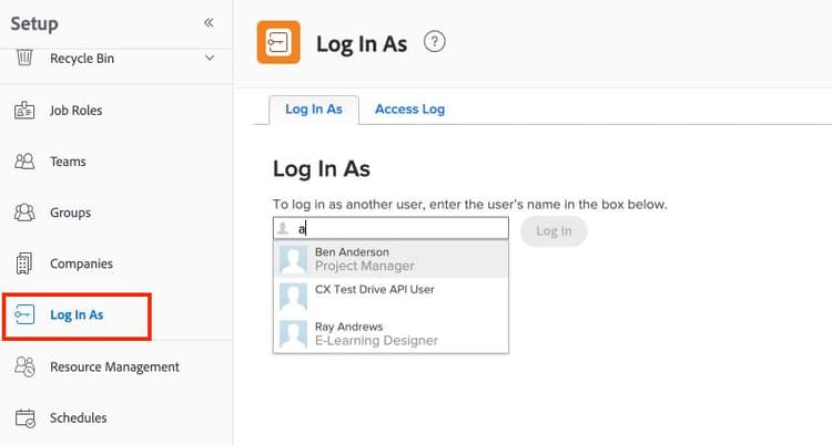 レイアウトテンプレートが作成されたので、カレンはそれらをテストします。セットアップエリアの「ログイン」機能を使用して、テンプレートを利用するユーザーとしてテストします。これにより、カレンはそのユーザーとしてWorkfrontを閲覧し、操作することができます。