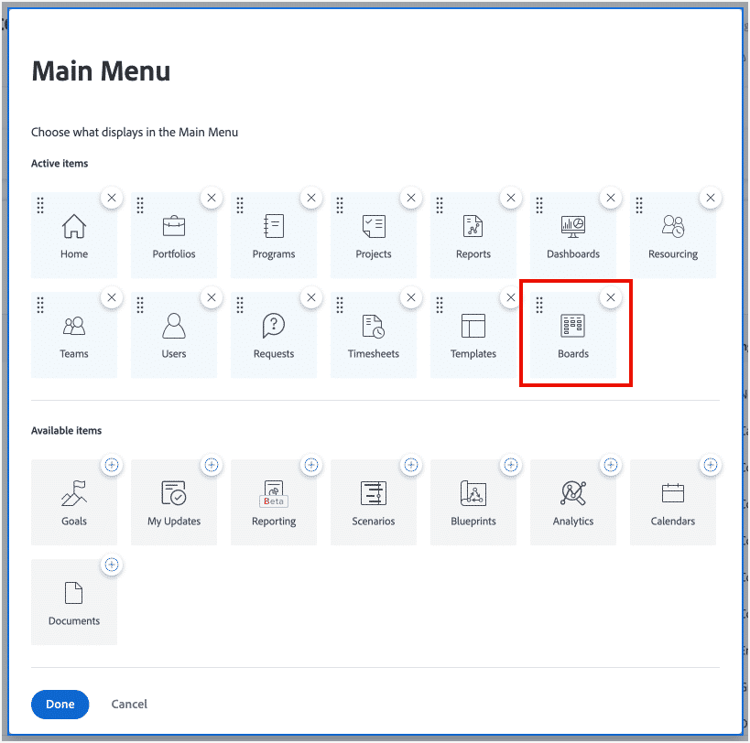メインメニューにボードを追加して、ユーザーが作業を管理する別の方法を提供します。