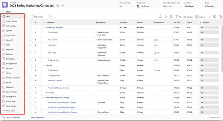 Adobe Workfrontの左パネルメニューとオブジェクトの詳細セクションをカスタマイズするだけでなく、プロジェクト、タスク、および問題のページヘッダーに表示されるフィールドを決定できます。