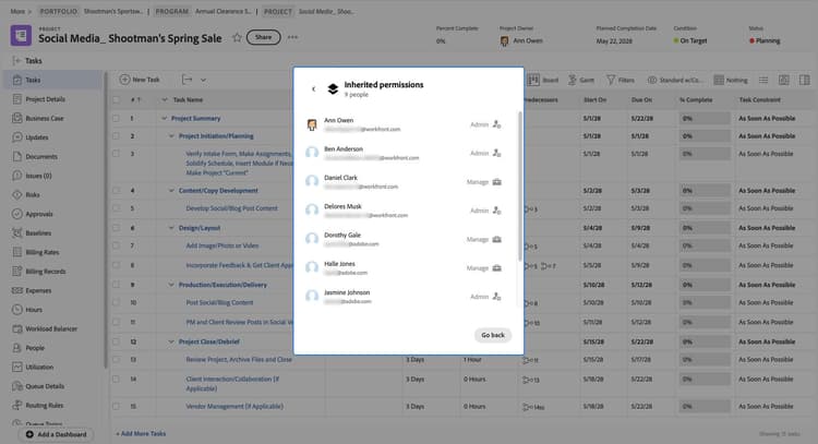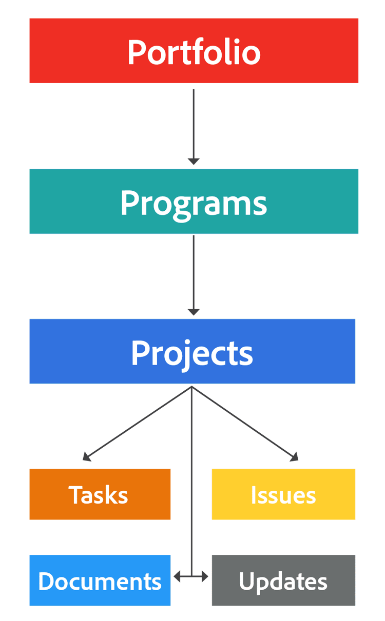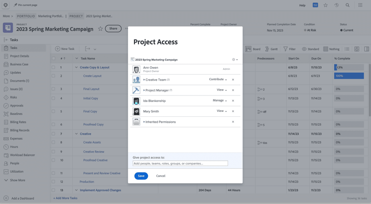 例えば、ポートフォリオはクリエイティブマーケティングチームと共有されます。デフォルトでは、そのポートフォリオ内のプログラムは同じ権限を引き継ぎます。そして、そのプログラム内のプロジェクトも同じ権限を引き継ぎます。