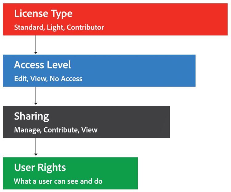 この画像は、アクセス権と共有権限の組み合わせが「ユーザー権利」と呼ばれるもの、つまりWorkfrontでユーザーがアクセスできるものにつながることを示しています。