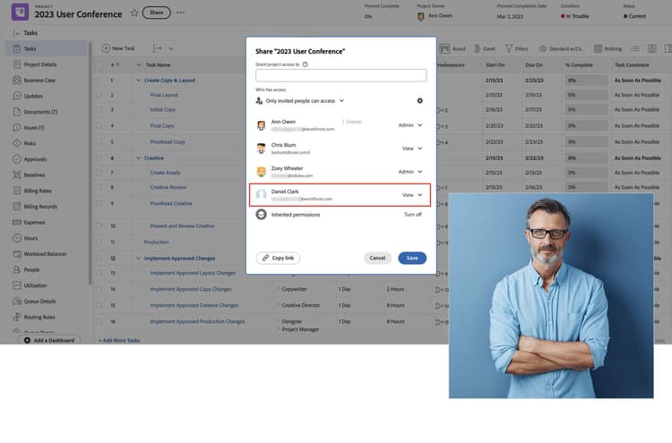これにより、アイテムの共有を維持することも容易になります。Workfront でチームメンバーが更新されると、アイテムの共有権限が自動的に更新され、新しいチームメンバーにアクセスが許可され、前のチームメンバーのアクセスが削除されます。