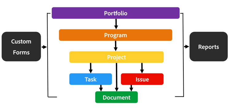 Adobe Workfrontのオブジェクト階層は、Workfrontで使用されるオブジェクトで構成されています。