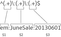 ^(.+)\:(.+)\:(.+)$em:JuneSale:20XX0601$0: em:JuneSale:20XX0601 $1: em $2: JuneSale $3: 20XX0601^= 行の先頭 () = 文字をグループ化し、括弧内の一致する文字を抽出します。(.+) = 1 ( .) 文字と ( + ) 任意の \ = 文字列の先頭。$ = 前の文字(または文字グループ)が行の末尾であることを示しています。正規表現の文字が何を意味しているかについては、 正規表現 - 参照表 を参照してください。