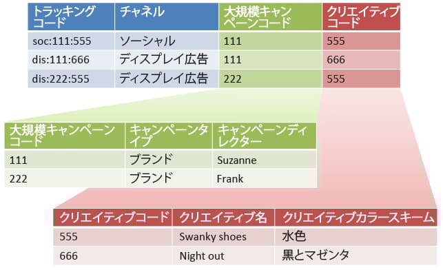 分類階層を使用すると、分類に対して分類を適用できます(sub-classification と呼びます)。つまり、複数のテーブルが含まれるリレーショナルデータベースのようにインポーターを使用することができます。あるテーブルでトラッキングコード全体をキーにマッピングし、別のテーブルでこれらのキーをさらに別のテーブルにマッピングします。