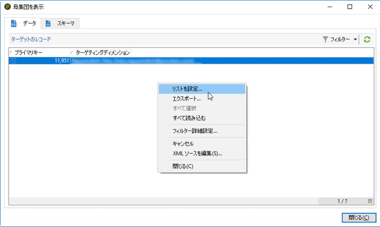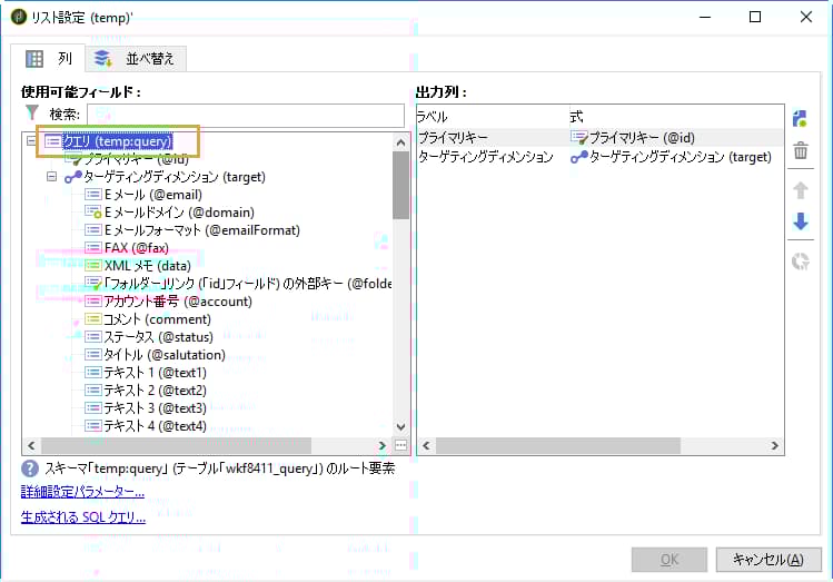 クエリターゲティングディメンションおよびフィールド名がリストに表示されます。