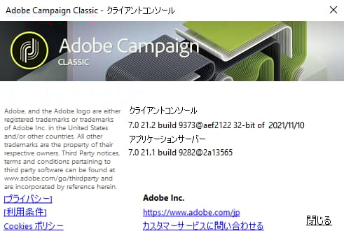 アドビのカスタマーサポートチームに連絡する場合は、Adobe Campaign クライアントコンソールおよびアプリケーションサーバーのバージョン番号とビルド番号を伝える必要があります。