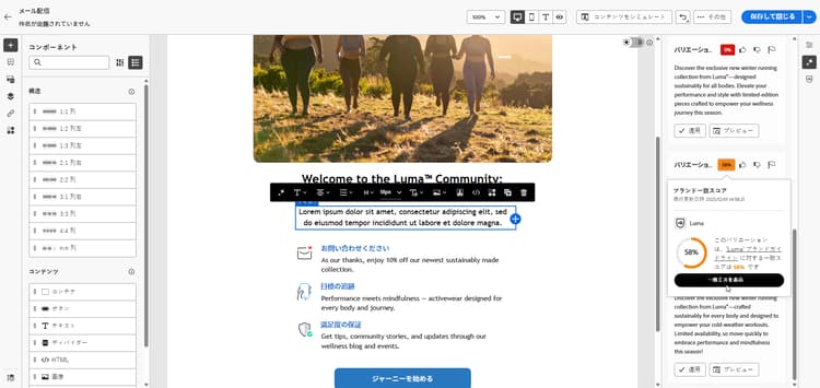AI アシスタントは、メール配信やランディングページに高品質なテキストコンテンツを生成できます。この機能により、デジタルタッチポイントをまたいでオーディエンスとつながる、魅力的でブランドに即したメッセージを作成できます。