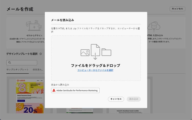 E メールデザイナーのホームページで、「HTML をインポート」を選択し、「Adobe GenStudio for Performance Marketing」ボタンをクリックします。