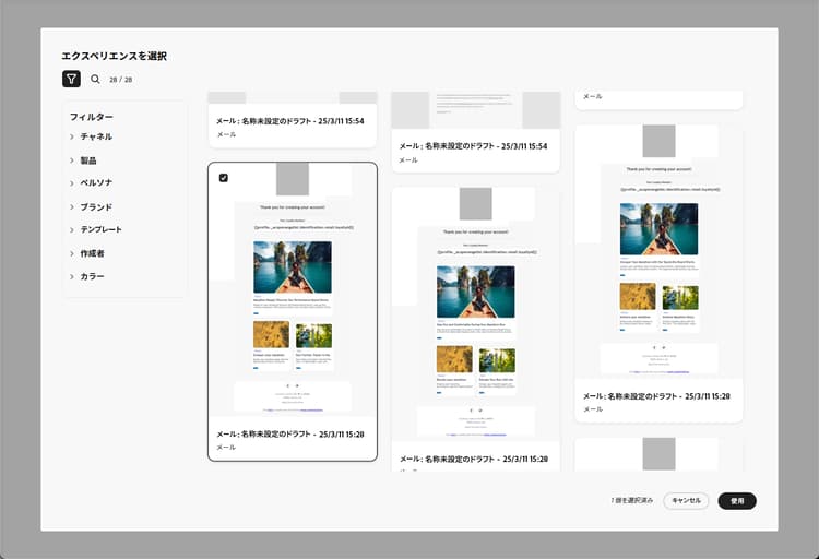 GenStudio エクスペリエンスを参照して、コンテンツの作成を開始します。製品、ペルソナ、ブランド、色など、複数の条件でエクスペリエンスをフィルタリングできます。