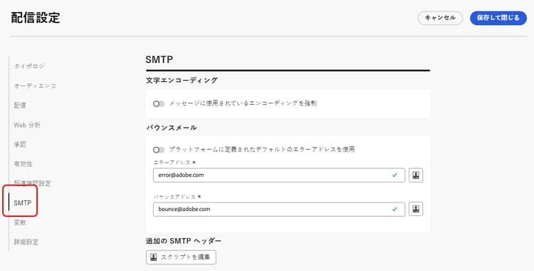 配信設定の「SMTP」タブで、メール配信に SMTP ヘッダーを追加できます。